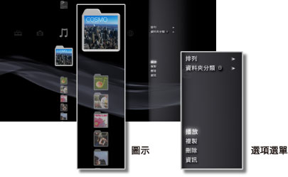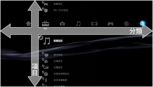 PS3™內建了一套名為「XMB™(交叉媒體廊)」的使用者介面。橫列會分類顯示PS3™之機能,直列則會顯示各類別中可執行的項目。