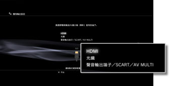 - 變更聲音輸出設定後,即無法從複數的輸出端子同時輸出聲音。例如,使用HDMI連接線連接PS3™和電視機,並使用光纖線連接PS3™和音響裝置時,若將[聲音輸出設定]變更為[光纖],即無法再從電視機輸出聲音。要從電視機輸出聲音時,請將設定變更為[HDMI],或將