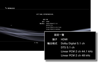 - 使用HDMI連接線,遊玩PlayStation®2/PlayStation®規格軟件時,僅能以[Linear PCM 2ch]輸出聲音。若要輸出以Dolby Digital或DTS®記錄的聲音,請使用位光纖連接線連接PS3™和音響裝置,並將[聲音輸出設定]調整為[光纖]。