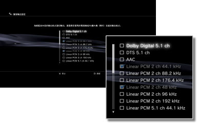 設定PS3™聲音輸出。連接家庭劇院用的AV擴大機(喇叭)等,支援數位聲音輸出的音響裝置時,始需調整的設定。