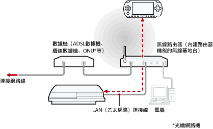 使用LAN連接線讓PS3™跟無線基地台連線後,使用PSP™的無線LAN機能,經由無線基地台與PS3™連線。