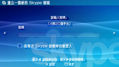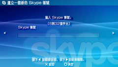 若想跟其他 Skype 用戶免費通話、利用 Skype 提供的各種需付費服務,首先必須新建帳號(Skype 暱稱)。若已透過個人電腦等使用 Skype 並已取得帳號,則可在PSP™版的 Skype 使用相同帳號享受同等服務。