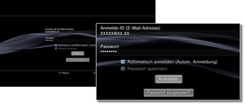 Wenn Sie Ihr Passwort speichern, wird das Passwort automatisch auf dem Anmeldebildschirm eingegeben. Wenn Sie auch noch die automatische Anmeldung einstellen, meldet sich das PS3™-System beim Einschalten automatisch am PSNSM an.