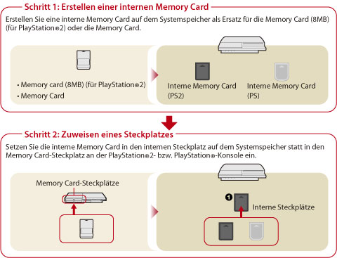 Speicherdaten für Software im PlayStation®2- oder PlayStation®-Format werden auf internen Memory Cards gespeichert, die im Systemspeicher erstellt wurden. Interne Memory Cards können Sie verwenden, indem Sie sie nach dem Erstellen Steckplätzen zuweisen. Die Daten werden unter