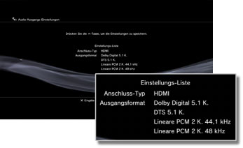 - Wenn Sie ein HDMI-Kabel verwenden, wird bei Software im PlayStation®2- und PlayStation®-Format nur Ton im Format [Lineare PCM 2 K.] ausgegeben. Wenn Sie Dolby Digital- oder DTS®-Ton ausgeben wollen, müssen Sie das PS3™-System und das Audiogerät über ein optisches Digitalkabel verbinden und unter [Audio-Ausgangs-Einstellungen] auf [Optisch digital] umschalten.