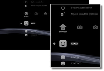 Sie können Benutzer erstellen oder das PS3™-System ausschalten. Wenn Sie mehrere Benutzer erstellen, werden Daten wie Speicherdaten für Software im PlayStation®3-Format, unter