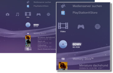 (im Systemspeicher gespeicherte Dateien) | Wiedergeben von Videodateien im Systemspeicher des PS3™-Systems. Dabei werden Miniaturbilder angezeigt. |