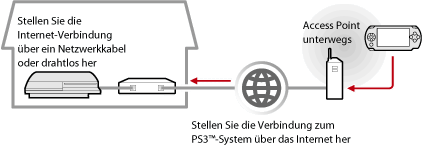 Verbinden Sie das PSP™-System von einem Zugriffspunkt (Hotspot) eines öffentlichen WLAN-Service aus über das Internet mit einem PS3™-System zuhause. Wenn Sie das PS3™-System in den Bereitschaftsmodus für die Remote Play-Verbindung schalten, können Sie Remote Play verwenden, wenn Sie unterwegs bzw. sogar im Ausland sind.