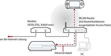 Schließen Sie das PS3™-System mit einem Netzwerkkabel an einen Zugriffspunkt an und stellen Sie mithilfe der WLAN-Funktion des PSP™-Systems über den Zugriffspunkt eine Verbindung zum PS3™-System her.