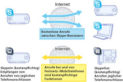 Skype ist eine Anwendung, mit der Sie kostenlos* über das Internet mit jeglichen anderen Skype-Anwendern weltweit telefonieren führen können. Skype für das PSP™ (PlayStation®Portable) -System verfügt über die folgenden Funktionen: