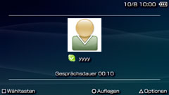 Skype kann für Konferenzgespräche mit drei oder mehr Teilnehmern verwendet werden. Wenn Sie Skype für das PSP™-System verwenden, können Sie an einem Konferenzgespräch teilnehmen, das von einem anderen Gerät gestartet wurde, aber Sie können keine anderen Personen zur Teilnahme am Konferenzgespräch einladen. Während eines Konferenzgesprächs werden nur Informationen über die Person, die das Konferenzgespräch gestartet hat, am Bildschirm angezeigt (so wie bei einem Gespräch zwischen zwei Teilnehmern).