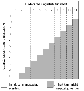 Aus der Kombination der Kindersicherungsstufen des PSP™-Systems und der UMD™ ergibt sich, ob sich die UMD™ wiedergeben lässt oder nicht. Bei welchen Kombinationen dieser beiden Stufen Inhalt wiedergegeben werden kann, zeigt die Tabelle unten.