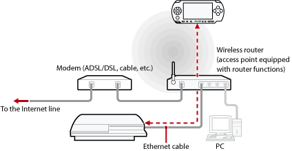 Connect the PS3™ system to an access point using a network cable, and then use the PSP™ system's wireless LAN feature to connect to the PS3™ system via the access point.