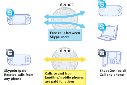 Skype is an application that lets you make free* calls over the Internet to anyone else using Skype, anywhere in the world. Skype for the PSP™ (PlayStation®Portable) system has the following functions: