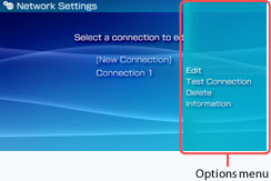 button with a saved network connection selected, the options menu will be displayed. You can edit settings information or perform a connection test.