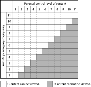 The combination of the parental control levels of both the PSP™ system and the UMD™ determine whether a UMD™ can be viewed or not. The combination of the two levels is displayed in the table below.