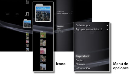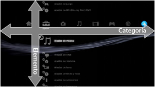 El sistema PS3™ incluye una interfaz de usuario llamada XMB™ (XrossMediaBar). La fila horizontal muestra las características del sistema por categorías y la columna vertical muestra las acciones que se pueden realizar en cada una de las categorías.