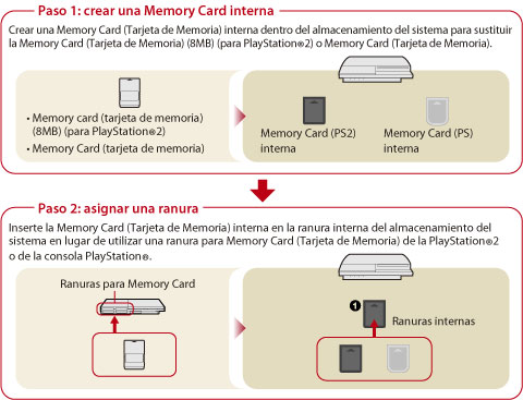 Los datos guardados para software de formato PlayStation®2 o PlayStation® se guardan en las Memory Cards (Tarjetas de Memoria) internas creadas en el almacenamiento del sistema. Para utilizar las Memory Cards internas, asígneles ranuras una vez creadas. Los datos se mostrarán en el menú
