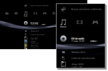(archivos guardados en el almacenamiento del sistema) | Permite visualizar archivos de música guardados en el almacenamiento del sistema del sistema PS3™. Si hay disponibles datos de imagen, se mostrarán las miniaturas correspondientes. |