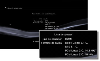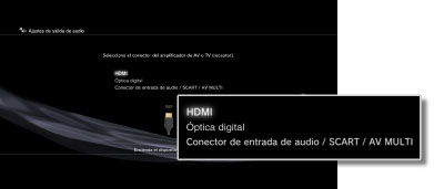 - Al utilizar un cable HDMI, solo el audio de [PCM Lineal 2 C.] se emitirá a través del software de formato PlayStation® y PlayStation®2. Para emitir audio en formato Dolby Digital o DTS®, debe conectar el sistema PS3™ y el dispositivo de audio mediante un cable óptico digital y cambiar a [Óptica digital] en [Ajustes de salida de audio].