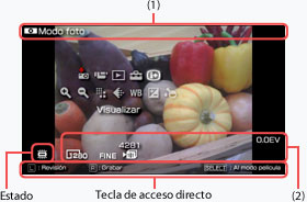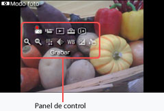 con la cámara en modo de espera para visualizar el panel de control. Los iconos visualizados varían en función de si la cámara se encuentra en el modo foto, modo película o revisión. Los iconos mostrados también varían en función del tipo de cámara.