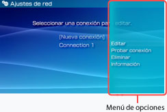 con una conexión de red guardada seleccionada, se mostrará el menú de opciones. Es posible editar la información de los ajustes o llevar a cabo una prueba de conexión.