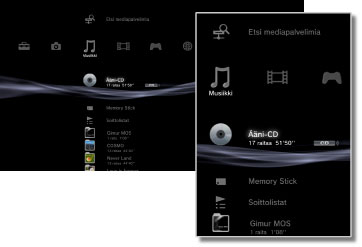 PSP™ (PlayStation®Portable) | Toista PSP™-järjestelmän Memory Stick™ -muistikortille tallennettuja musiikkitiedostoja. |