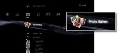 Photo Gallery on sovellus, joka parantaa PS3™ -järjestelmään tallennettujen valokuvien katselukokemusta. Voit ryhmitellä valokuvasi eri tavoin, esimerkiksi päivämäärän ja kellonajan tai kuvissa näkyvien ihmisten määrän mukaan. Voit myös luoda valituista valokuvista soittolistan ja valita sitä varten kuvakehyksen. Saat lisätietoja Photo Galleryn käytöstä valitsemalla tämän.