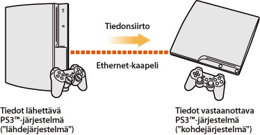 Voit siirtää (kopioida tai siirtää) yhden PS3™-järjestelmän tallennustilaan tallennettuja tiedostoja toisen PS3™-järjestelmän tallennustilaan Ethernet-kaapelin avulla.