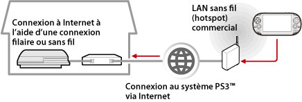 En utilisant un périphérique qui prend en charge la lecture à distance, notamment un système PS Vita ou un système PSP™, et un point d'accès sans fil, vous pouvez vous connecter à votre système PS3™ via Internet. Pour utiliser la lecture à distance, le système PS3™ doit être configuré en mode veille de connexion de lecture à distance.