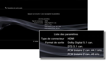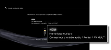 - Si vous utilisez un câble HDMI, seul le son du [PCM linéaire 2 can.] est reproduit à partir des logiciels au format PlayStation®2 et PlayStation®. Pour reproduire du son Dolby Digital ou DTS®, vous devez raccorder le système PS3™ au périphérique audio à l'aide d'un câble optique numérique et basculer vers [Numérique optique] sous [Paramètres de sortie audio].