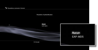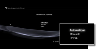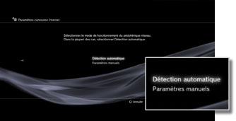 | Automatique | Pour utiliser la fonctionnalité de réglage automatique du point d'accès. Cette option est uniquement disponible dans les régions où les systèmes PS3™ qui prennent en charge cette fonctionnalité sont vendus. Sélectionnez cette option si vous utilisez un point d'accès prenant en charge la configuration automatique. Suivez les instructions affichées. |