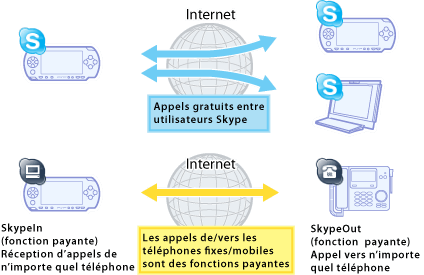 Skype est une application permettant d'appeler gratuitement* via Internet un autre utilisateur Skype, n'importe où dans le monde. Skype pour le système PSP™ (PlayStation®Portable) propose les fonctions suivantes :