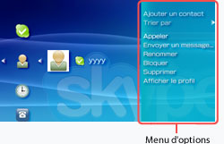 | Appeler | Pour appeler un contact. Lorsqu'un numéro de téléphone est enregistré en plus d'un pseudonyme Skype, une liste s'affiche pour vous permettre de sélectionner le pseudonyme Skype ou le numéro de téléphone adéquat. |