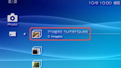 Si vous utilisez un appareil photo numérique compatible avec le support Memory Stick™, vous pouvez afficher les images en insérant le support Memory Stick™ directement dans le système PSP™. Les images s'affichent dans le dossier Images numériques (DCIM) du système.