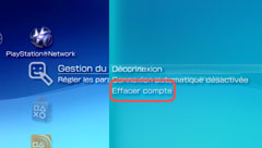 Si vous sélectionnez l'option [Effacer compte], l'association entre le système et le compte PlayStation®Network est supprimée. Le compte PlayStation®Network proprement dit n'est pas supprimé et est toujours enregistré sur le serveur PlayStation®Network. Vous pouvez continuer à utiliser ce compte sur un système PS3™, sur un autre système PSP™ ou sur un PC.