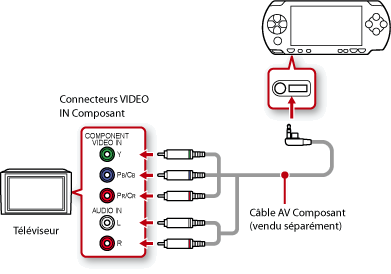 Raccordez le système PSP™ au téléviseur à l'aide d'un câble de sortie vidéo (vendu séparément). Exemple : raccordement du système PSP™ à un téléviseur avec connecteurs d'entrée vidéo composant