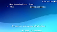 - Vous pouvez enregistrer jusqu'à huit périphériques Bluetooth® auprès d'un même système PSP™. Si vous ne parvenez pas à enregistrer un périphérique car vous avez atteint le nombre maximum de périphériques autorisés, essayez de supprimer un périphérique enregistré.