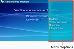 alors qu'une connexion réseau enregistrée est sélectionnée, le menu d'options s'affiche. Vous pouvez modifier les informations sur les paramètres ou réaliser un test de connexion.