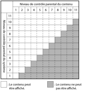 La combinaison des niveaux de contrôle parental du système PSP™ et de l'Universal Media Disc déterminent si l'Universal Media Disc peut être affiché ou non. La combinaison des deux niveaux est représentée dans le tableau ci-dessous.