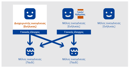 Ως γονέας ή κηδεμόνας, μπορείτε να κάνετε ρυθμίσεις γονικού ελέγχου. Ο διαχειριστής της οικογένειας μπορεί να ορίσει ένα άλλο ενήλικο μέλος ως γονέα ή κηδεμόνα. - Μέλη οικογένειας
