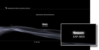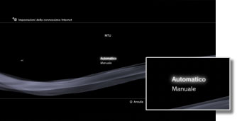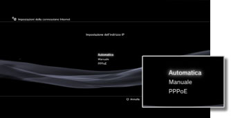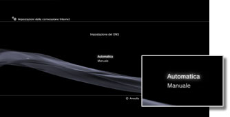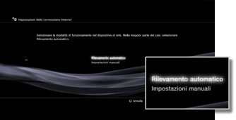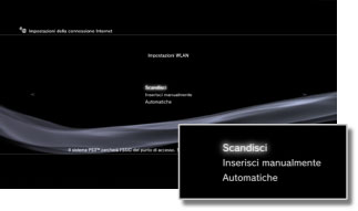 | Automatiche | Consente di utilizzare la funzione di impostazione automatica del punto di accesso. Questa impostazione è disponibile solo nelle regioni in cui vengono venduti sistemi PS3™ che supportano la funzione. Selezionare questa impostazione quando si utilizza un punto di accesso che supporta la configurazione automatica. Seguire le istruzioni sullo schermo. |
