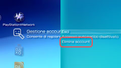 Se si seleziona l'opzione [Elimina account], l'associazione tra il sistema e l'account PlayStation®Network sarà eliminata. L'account PlayStation®Network non verrà eliminato e rimarrà registrato sul server PlayStation®Network. È possibile continuare ad utilizzare quell'account su un sistema PS3™, su un sistema PSP™ diverso o su un computer.