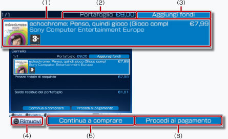 - Se si seleziona [Compra adesso] per un articolo da acquistare al punto 3, è possibile saltare la pagina del carrello degli acquisti e procedere direttamente alla schermata di conferma degli acquisti (punto 6). Se i dati della carta di credito sono registrati sull'account PlayStation®Network, i fondi verranno aggiunti automaticamente quando nel portafoglio non vi sono fondi sufficienti per completare l'acquisto.