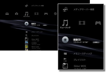 (本体ストレージに保存された音楽ファイル) | PS3™の本体ストレージに保存された音楽ファイルを再生できます。画像データがあるときは、縮小された画像(サムネイル)が表示されます。 |