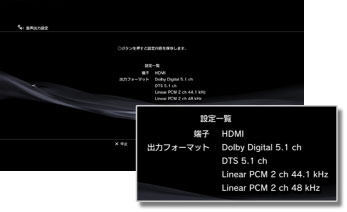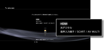 - HDMIケーブルを使っているときは、PlayStation®2 / PlayStation®規格ソフトウェアからは[Linear PCM 2ch]の音声だけしか出力できません。Dolby DigitalやDTS®の音声を出力するには、PS3™とオーディオ機器を光デジタルケーブルで接続して、[音声出力設定]を[光デジタル]に切りかえてください。