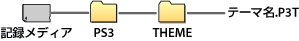 パソコンを使ってWebサイトからテーマをダウンロードしたり作成したりしたときは、記録メディア内に[PS3]-[THEME]というフォルダーを作成し、その中にテーマファイルを保存します。テーマファイルは[.P3T]という拡張子で保存してください。