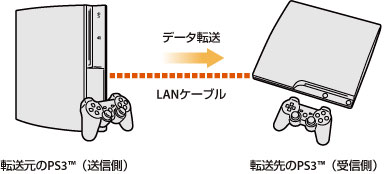 2台のPS3™の電源を切った状態で操作を始めてください。この機能を使って転送できるデータは、転送先のPS3™にコピー(複製)されます。コピー禁止のゲームセーブデータや著作権保護されたコンテンツなどはムーブ(移動)されます。