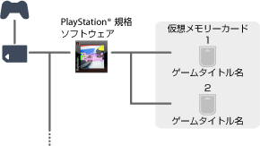 仮想メモリーカードは、ダウンロードしたゲームを起動すると自動的に作成されます。1つのソフトウェアにつき、2つの仮想メモリーカード(MEMORY CARD 差込口1と2用)が作成され、ゲームのタイトルと同じ名前で保存されます。