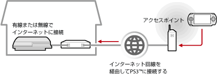 ホットスポットなどと呼ばれる公衆無線LAN サービスのアクセスポイントから、自宅のPS3™にインターネット経由で接続します。PS3™を接続待機状態にしておくことで、自宅から離れた場所や、海外からリモートプレイをすることができます。